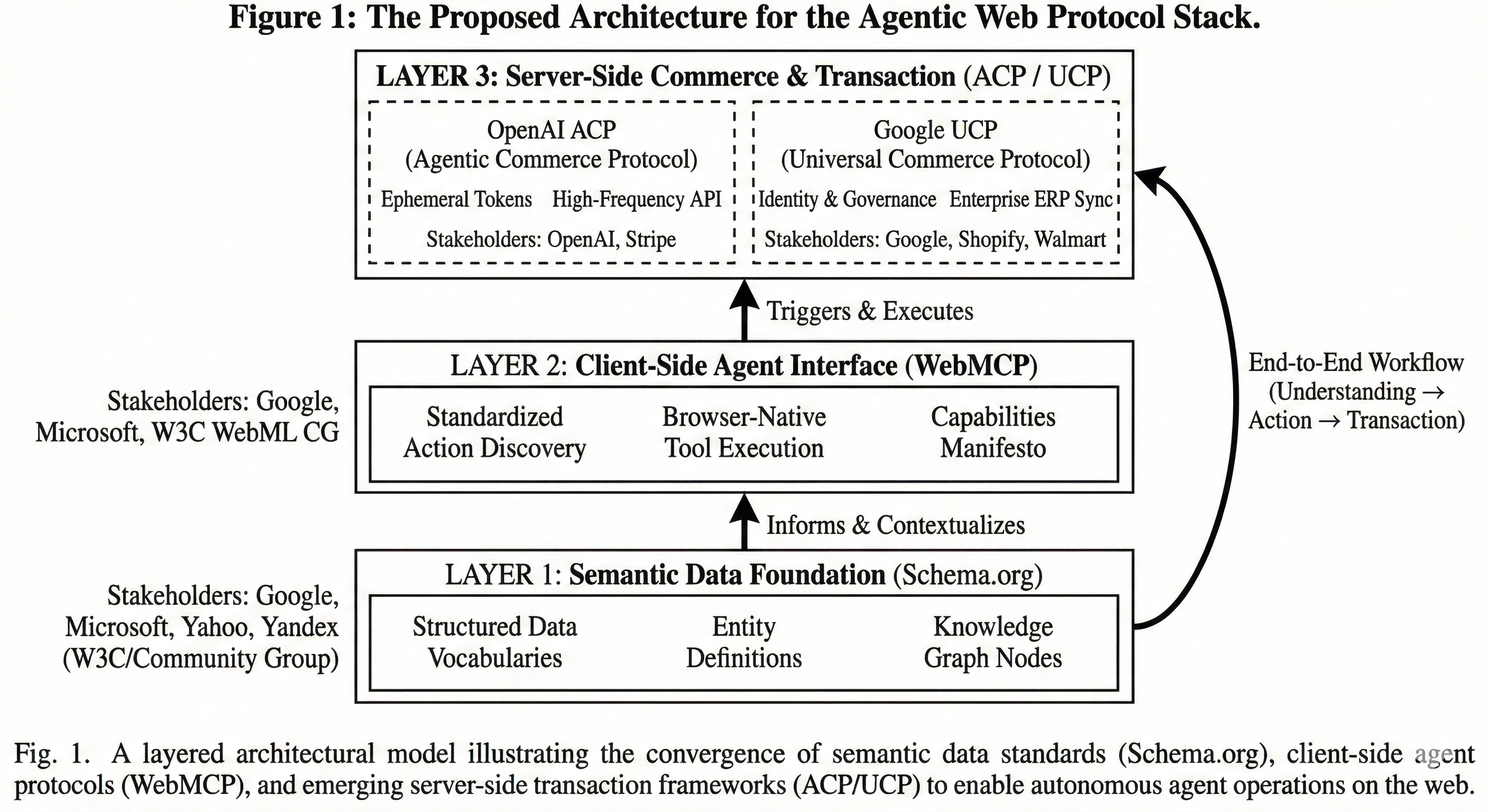 This shift requires a new infrastructure, a “Full Stack” for the Agentic Web. While WebMCP enhances the client-side (the browser), it is part of a broader ecosystem made of critical server-side standards that complete the picture: OpenAI’s ACP and Google’s UCP.